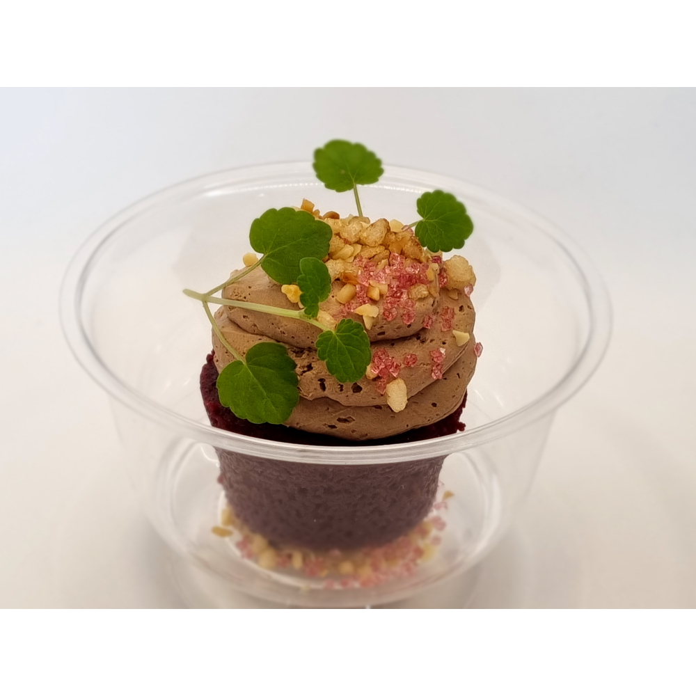 nagerecht van chocolademousse met hazelnoot op een cake van red velvet