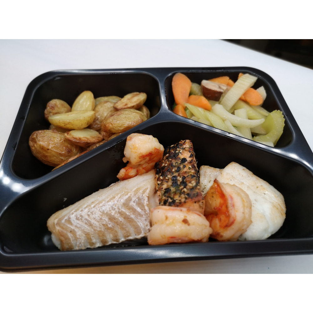 Potje vol vis, tong, zalm, kabeljauw en scampi's in witte wijnsaus.