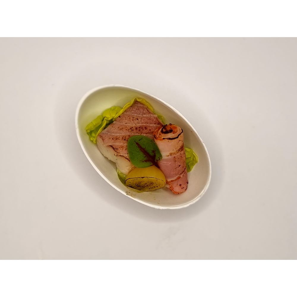 - scampi met gedroogde ham met truffelmayonaise en little gem